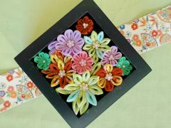 - パズルのようにつまみ細工を小箱に敷き詰めて、花溢れるアレンジBOXに