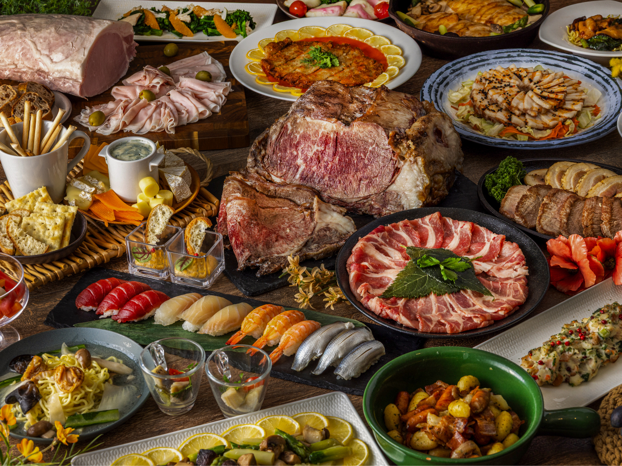 - 和牛サーロインのローストビーフを始め、パフォーマンスコーナーで仕上げる出来立てのお料理をご用意いたします。さらに、ホテル内レストラン「中国料理 古稀殿」、「和食 むさし野」監修の新メニューも登場。