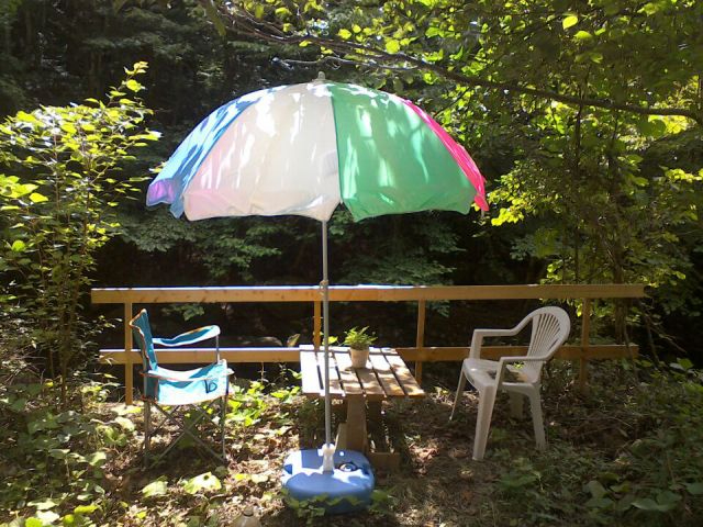 - 堰の上で流水音を聞きながら過ごせ、脇に椅子やテーブルが利用でき、ドアの開閉音、エアコンの排気音、FFヒーターの排気音等生活音を気にせずくつろげます。(流水量にもよります)