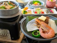 - 旨味と香りがぎゅっと詰まった、鮭と茸の釜飯をご用意! 旬魚のお造りや海鮮棒葉味噌焼きなど、 日帰りでも充分ご満足いただけるコースをご用意! 日本海を眺める露天風呂で秋の日帰り旅行をお楽しみください。