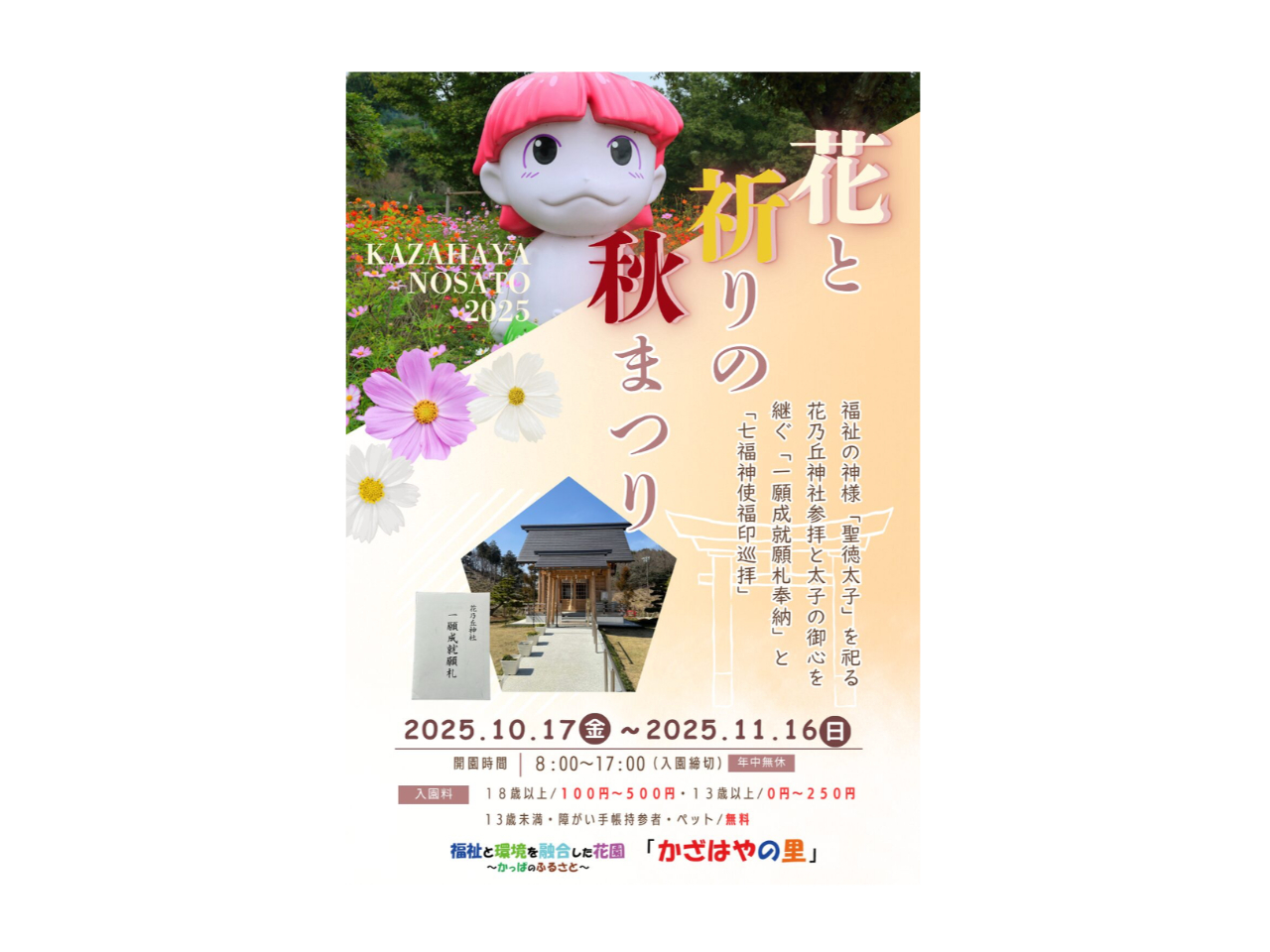 - ・700万本のコスモスが咲き広がる秋花まつり♪ ・聖徳太子の七福神使の福印巡礼をお楽しみいただけます! ・お弁当持込みOK