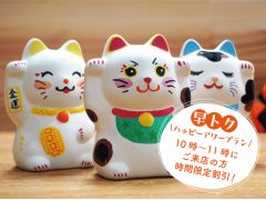 - ■10時から11時までの1時間の間にご来店の方だけの特別価格! ■素焼きのかわいい猫に自由に絵付けできる♪ 気分はアーティスト気分☆ ■右手はお金、左手は人、両方願う欲張りさんは両手あげ♪