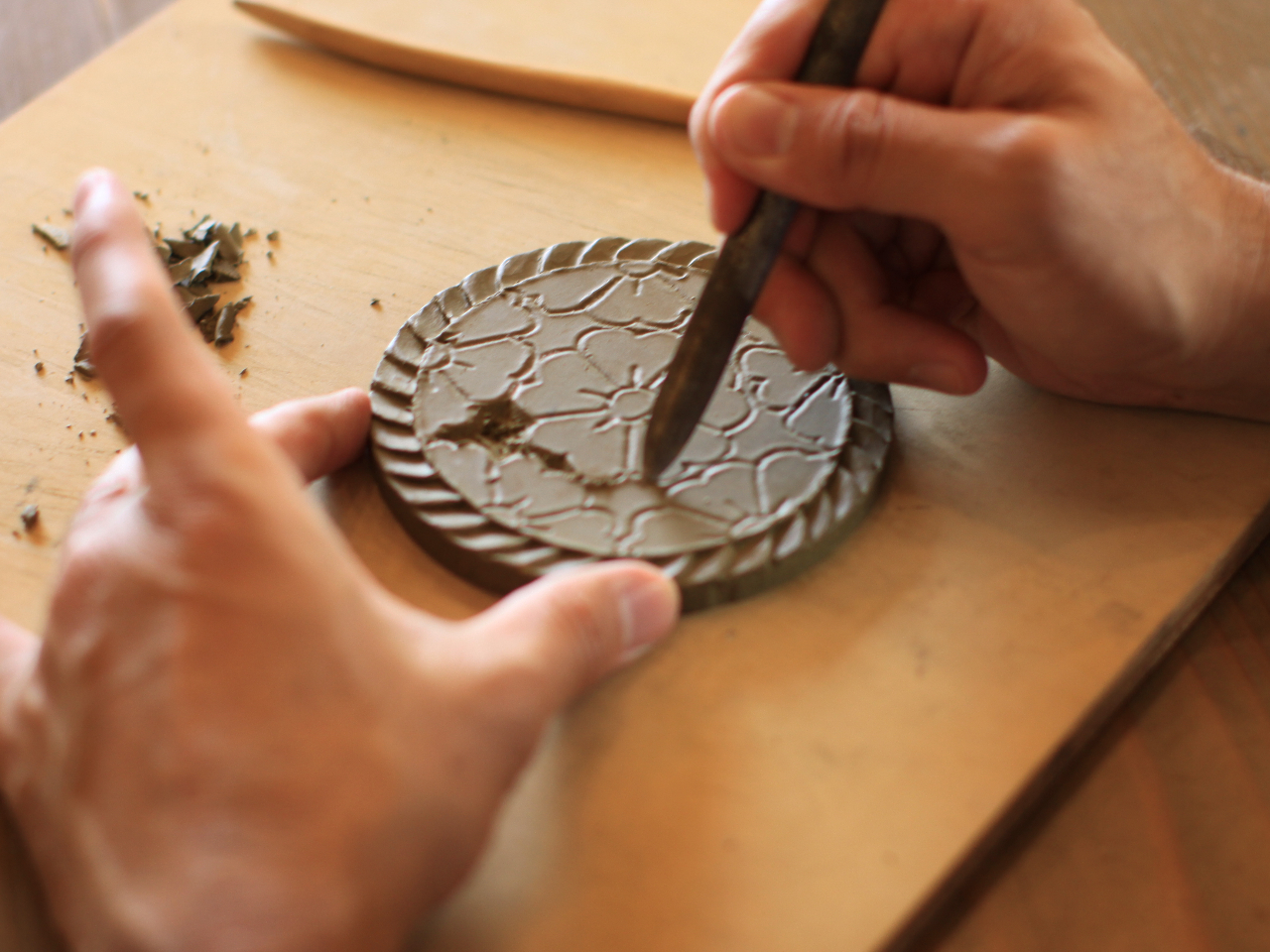 ●午前の部【23cm角タイル状板瓦粘土】淡路瓦粘土で彫刻体験