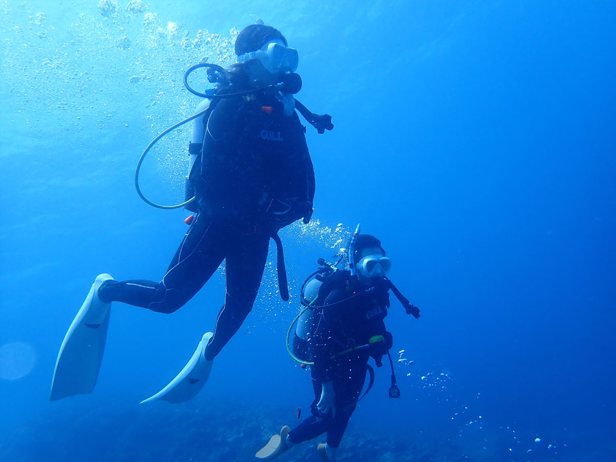 - 疑問や不安などをその場で解消しながら、お客様のスキルや体力に合わせたコーチングが特色! 初日は穏やかなビーチで行うため、海洋講習前に安心して基本的なスキル+ビーチダイビングのスキルを習得可能です!