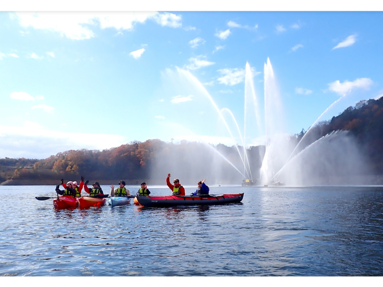 【三次市三良坂町】虹色の噴水に輝くハイヅカダム湖でのカヤック・クルージングツアー