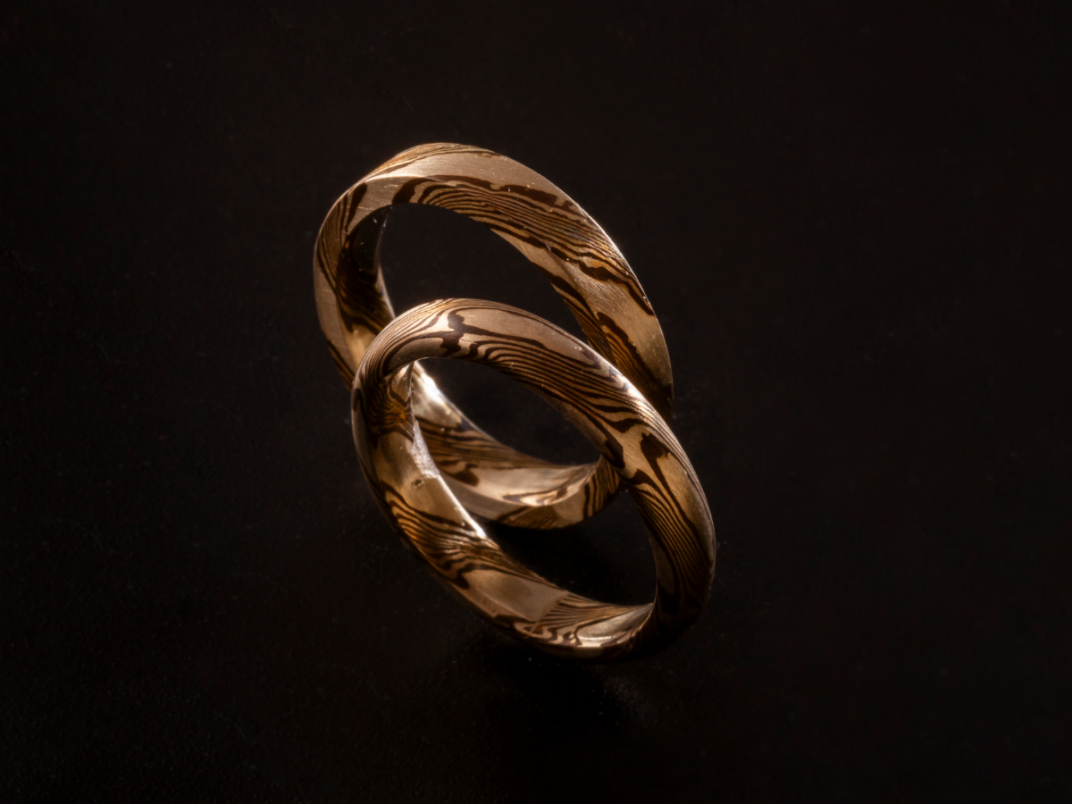 - 日本の伝統技法「木目金」の地金を使って仕上げるペアリング。 磨くたびに現れる模様が、二人だけの証になります。