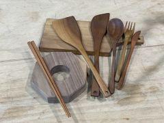 地元・ゆふいんの雑木を使用したスタンダードな箸から、手削り箸、魚箸、麺箸、梅枝の取り箸、箸置き、箸袋などお箸に関連したものの他にスプーン、フォーク、バターナイフなど、食卓...