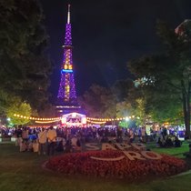 ライトアップされたテレビ塔を背中に、たくさんの提灯が会場を飾り、