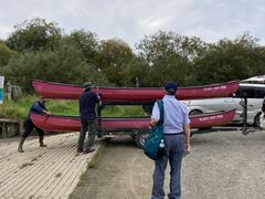 カヌーを車の後ろの台車に乗せて、塘路湖まで戻ります。
