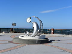ツアーで訪問しました。手前にイルカと時計台があり、はるか遠くに利尻富士が見えます。晴れると右手に宗谷岬も見え、日本海に沈む夕日が見えるそうです。が、曇った昼間で残念でした。