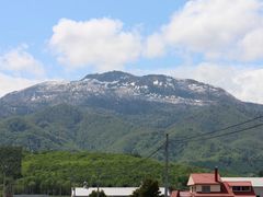 布部からチーズ工房に向かう道道を走ると、道路沿いにだんだん富良野西岳が迫力ある姿で迫ってきます。5月末ですが頂上部はまだ雪も残っていて雄大な眺めです。麓の朝日ケ丘公園のそばではまた違った形で威容を見せてくれました。
