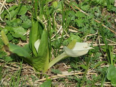 4月中下旬、奥の方での湿地でミズバショウの群落が見られます。