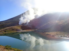 旭岳ロープウエイ終点「姿見駅」からゆっくり歩いて30分ほど、鏡池などを経て姿見の池に至ります。姿見の池の向こう側には地獄谷から立ち上がる噴煙を望むことができます。9月中旬、紅葉を期待して行ったのですが、未だ少しばかり早かったようでした。