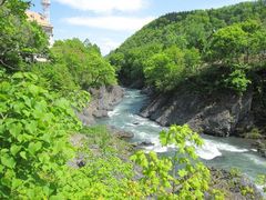 渚滑川のホテル渓谷から滝上市街地方面に向かう川沿いは錦仙峡と呼ばれ美しい自然が有名です。遊歩道が整備されていて私自身も木々が芽吹く春、緑眩しい真夏には何回か訪れました。今回の訪問は5月の連休でしたがホテル渓谷の裏から「洛陽の滝」まで散策しました。勢いよく流れる滝の水しぶきが迫力満点でした。