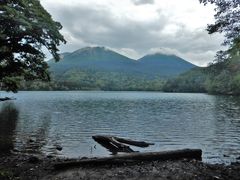 雌阿寒岳と阿寒富士を望む静かな湖。