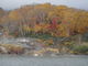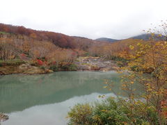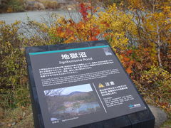 奥入瀬渓流から青森県に入って間もなくすると、車が道路脇に数台止まっているのに気づきました。後ろに車を止めて、ドアを開けると外は硫黄の臭いがプンプン。池の奥から白い湯気が立ち上っていました。紅葉の赤や黄色に花を添えるかのように、白い蒸気が霧のようにかかっていてかなり幻想的でした。