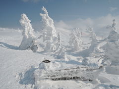 蔵王,八幡平と同じくアオモリトドマツが広く分布し素晴しい樹氷をつくる。怪奇・神秘の境として有名。見頃は2月上旬?3月中旬。