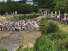 夏のよこはま祭りで行ってきました。三保野川は浅く緩やかな流れの川で、魚も泳いでいます。お祭りではそこで「ヤマメのつかみ取り」を開催。またそのすぐ上には広い芝生が広がって、遊具もいくつかあり、のんびりできます。