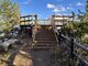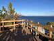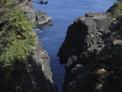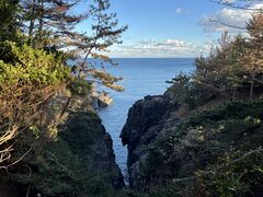 温泉近くに案内板があり、少し歩くとV字峡谷があり、さらにその先に太平洋を見渡せる展望台がある。正面右側に灯台が目印の椿島、双子島の青松島、その後ろには唐桑半島が見通せる。唐桑半島のさらに左奥に牡鹿半島と金華山シルエットも確認できた。