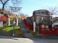 東洋一の奇岩。天王山公園入口にある周囲10m,高さ5m余りの天然御影石の巨岩。隣接する岩と合わせて夫婦和合の神とされる。