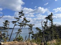 大島南端の駐車場横に遊歩道入り口。灯台までちょっとだけ上がっていくが、良く整備された道は松林と海景に囲まれている。灯台まで行くと本州側の気仙沼を見渡せる。また、本州と逆側に目を向けると、周辺の小島にぶつかって渦巻く波なども美しい。