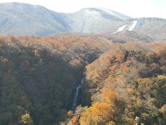 宮城蔵王の遠刈田温泉から山形蔵王方面へ続く蔵王エコーライン、その途中にある滝見台から、三階の滝と不動滝の両方が見られます。11月上旬の紅葉時期だったのですが、前日降雪があったため、この先の道路は通行止めとなっていました。それでも展望台から見る蔵王の爽快感がよかったです。