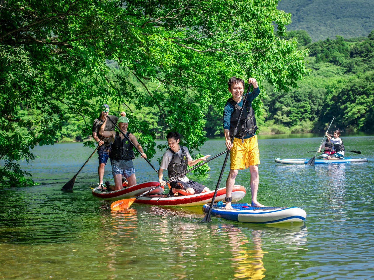 木々に囲まれた自然の中で、ガイド付きでSUP体験ができます。夏は新緑、秋は紅葉の長老湖の真ん中で絶景の景色を一望できます!