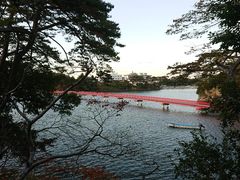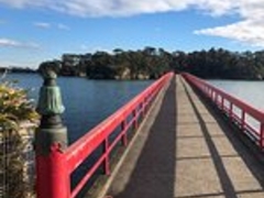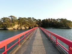 高城町方面から松島海岸に向かって海沿いに歩いていると、松島の風景が素晴らしい。日和につられてのんびり行くと前方に赤い橋が見えてきた。あぁあれが名所福浦島へ渡る橋か?と近づいていくと橋の袂には柵が。嫌な予感がしたら、有料だった。島に渡るとさらなる絶景が。島の真ん中あたりにはピクニックにもってこいの公園があり、清々しい。