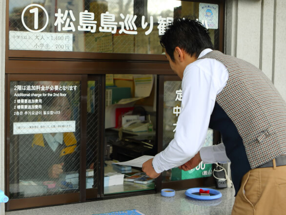@4つの乗船券発売所のどちらかに向かって下さい。(松島海岸駅前に1つ、海沿いに3つあります)