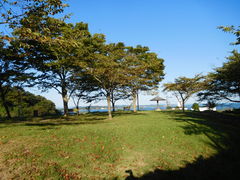 駐車場からすぐのところにトイレと芝生広場があります。松島の島々や金華山、塩釜の街並みが見えます。