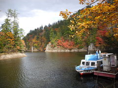 太平湖は、森吉ダム(高さ68m)の完成によってできた人造湖(周囲30km・面積1.95平方km)です。湖には大小13の渓谷渓流が注ぎ、ニジマスやイワナ、コイ、ワカサギなどが多く生息し釣客でにぎわい、遊覧船「森吉丸」が6月1日〜10月31日まで小又峡との間を周航しています。