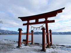 ここ御座石神社もそんなスポットの一つで、湖岸に立つ赤い鳥居がけっこうフォトジェニックでした。