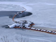 噴水はお休み中で周囲には積雪多く氷結湖面は
