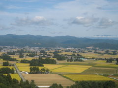 お寺の向かいにある駐車場に車を止めて徒歩で山を上がっていきます。徒歩15分くらいで展望台に到着しました。一面に広がる水田と防風林に囲まれた農家が美しい景観を創り出しています。