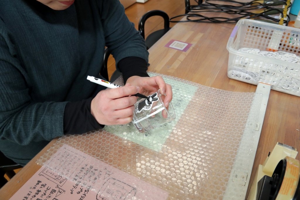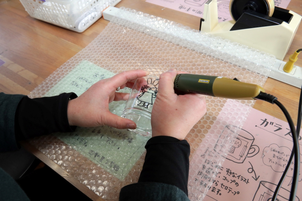 選んでいただいたイラストをコップの内側に貼り付け、ガラスに油性ペンで下絵を描き、その下絵の線に合わせてリューターという道具で彫り柄を入れていきます♪