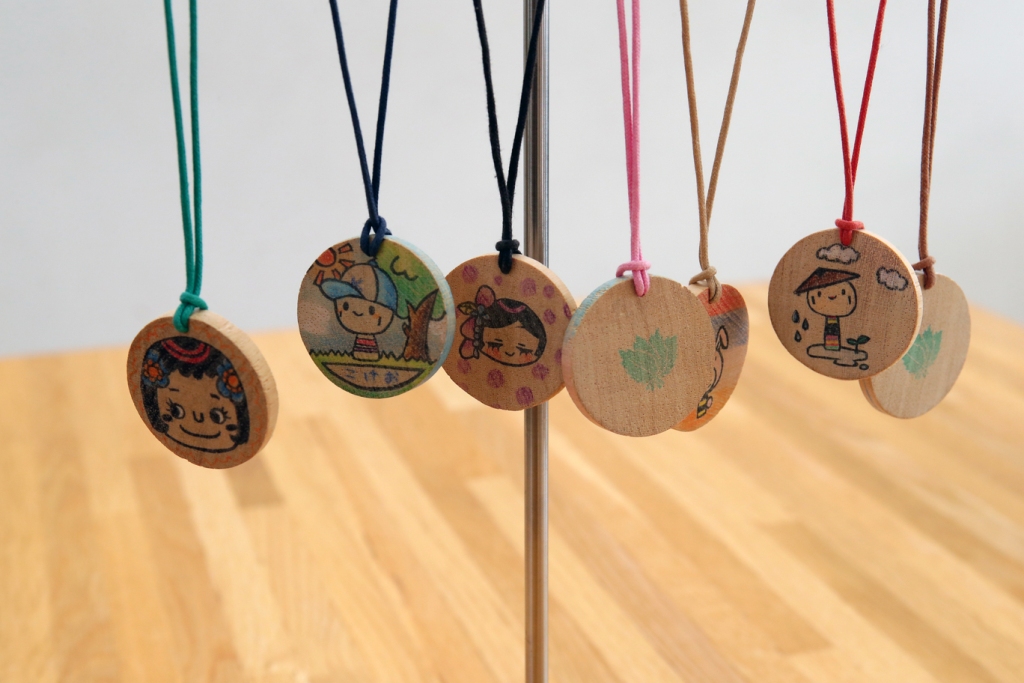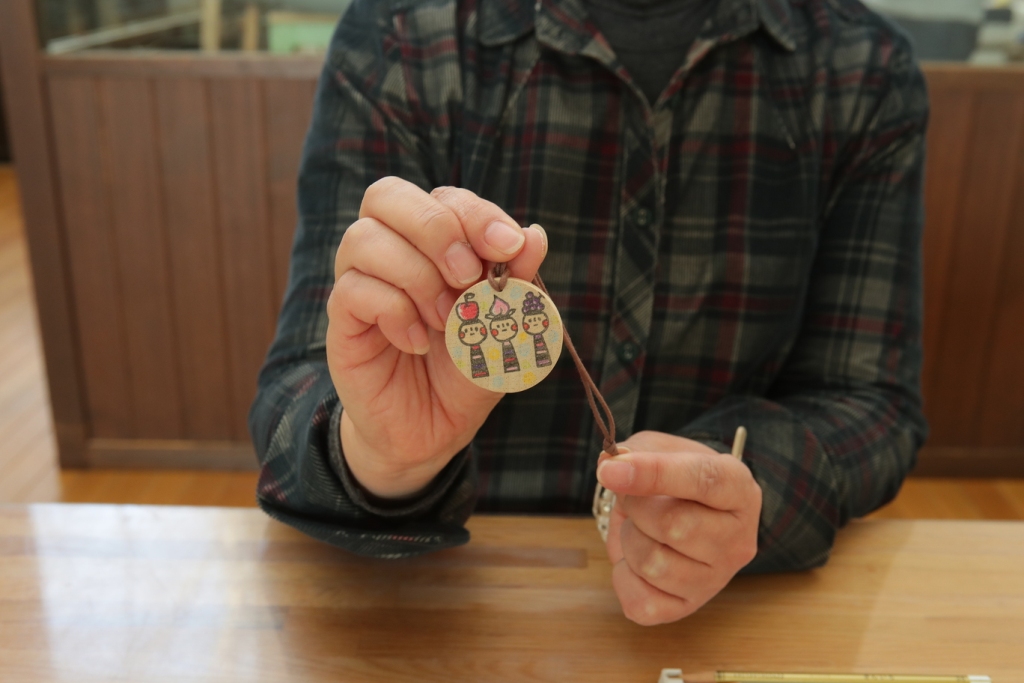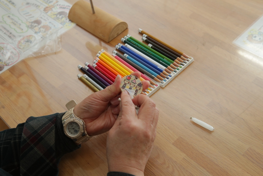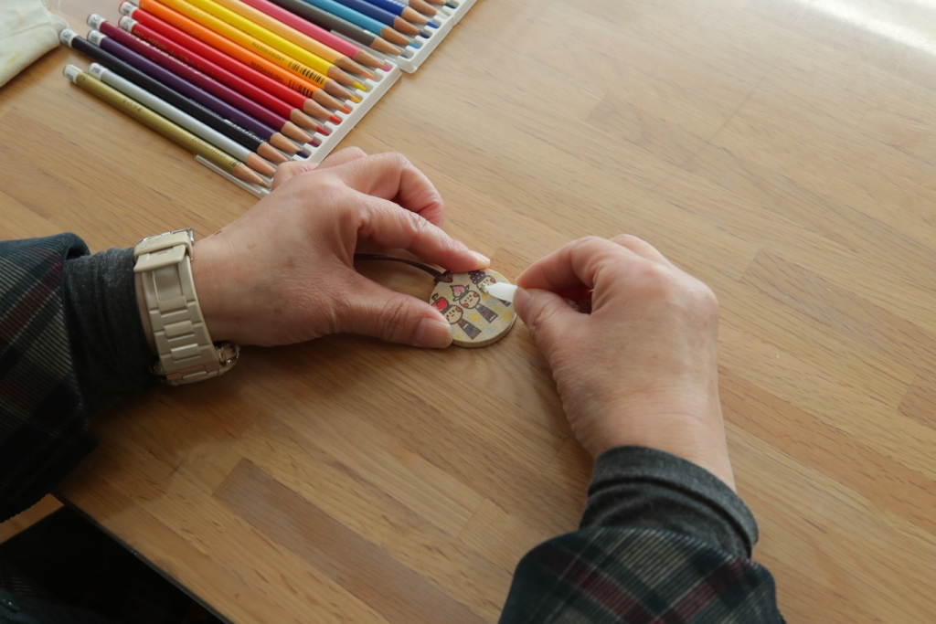 ・10種類の丸形キーホルダーから好きな絵柄を選んで、色鉛筆で絵付けします