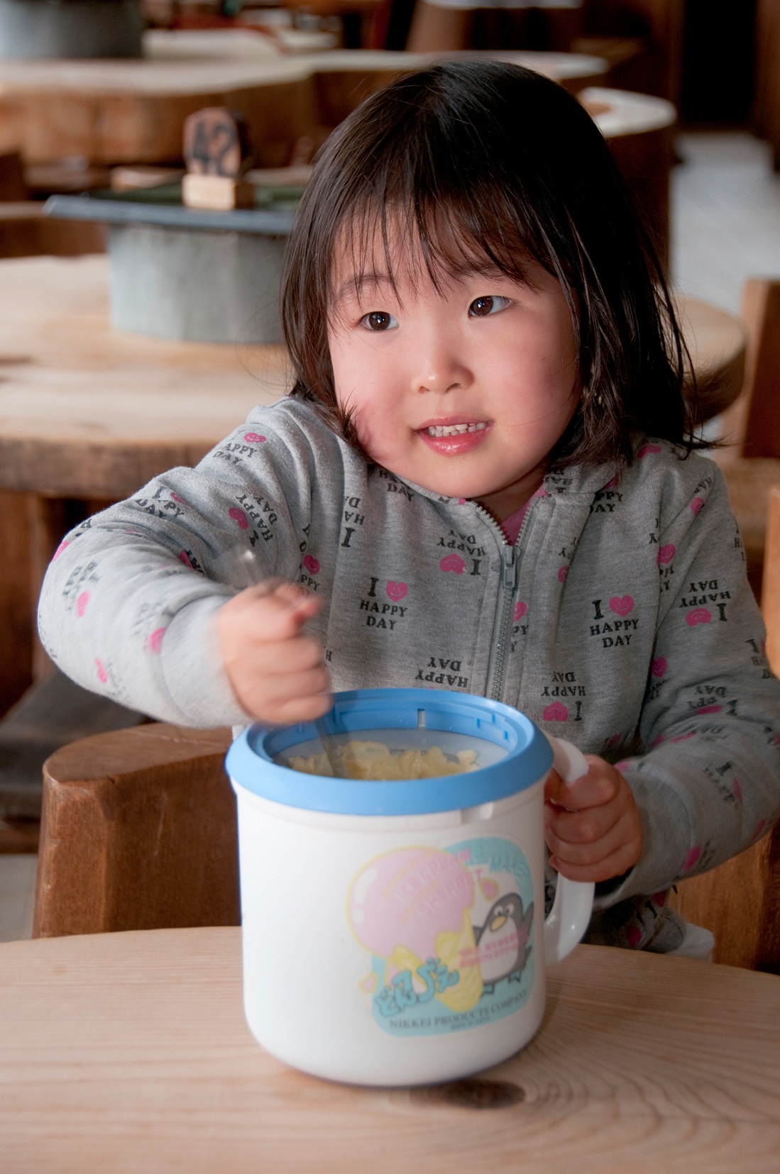 A冷えた専用容器に入れてスプーンでかき混ぜると、フレッシュアイスクリームのできあがり!!