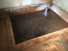 笹濁り、湯の表面が貝汁色。金気に炭酸、そして甘塩ダシの湯はお決まり。浴槽にどっぷりと浸かるとオーバーフロー。