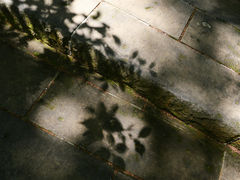 駐車場からエントランスへ、大谷石の階段に木漏れ日が差します。