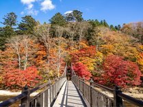 秋の訪れとともに色づく渓谷と散策道、優しく包み込む温泉の湯気が、