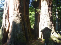 塩原温泉の上を通る中塩原バイパス沿いに鎮座する塩原八幡宮の境内に、一際大きな2本の大杉が聳えています。高さ約40m、幹回りは10m前後の夫婦杉で、樹齢は何と1500年という古木ですが、樹勢盛んで若々しいパワー溢れる大杉でした。
