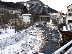 チェックインしたホテルの部屋は最上階、カーテンを開けると寒々とした塩原温泉街が見下ろせます。人通りも見当たらず車が通るのみ、商店も開店休業状態でした。