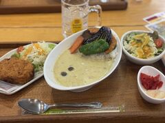 受付で入浴券を買ってまずは、腹ごしらえ。いのぶた推しだったので、いのぶたカツといのぶたチャーシュー麺を頼もうかなぁとメニューを見ながら券売機に行くと…メニューにはないグリーンカレーが!すぐにメニュー変更してグリーンカレーをポチ。