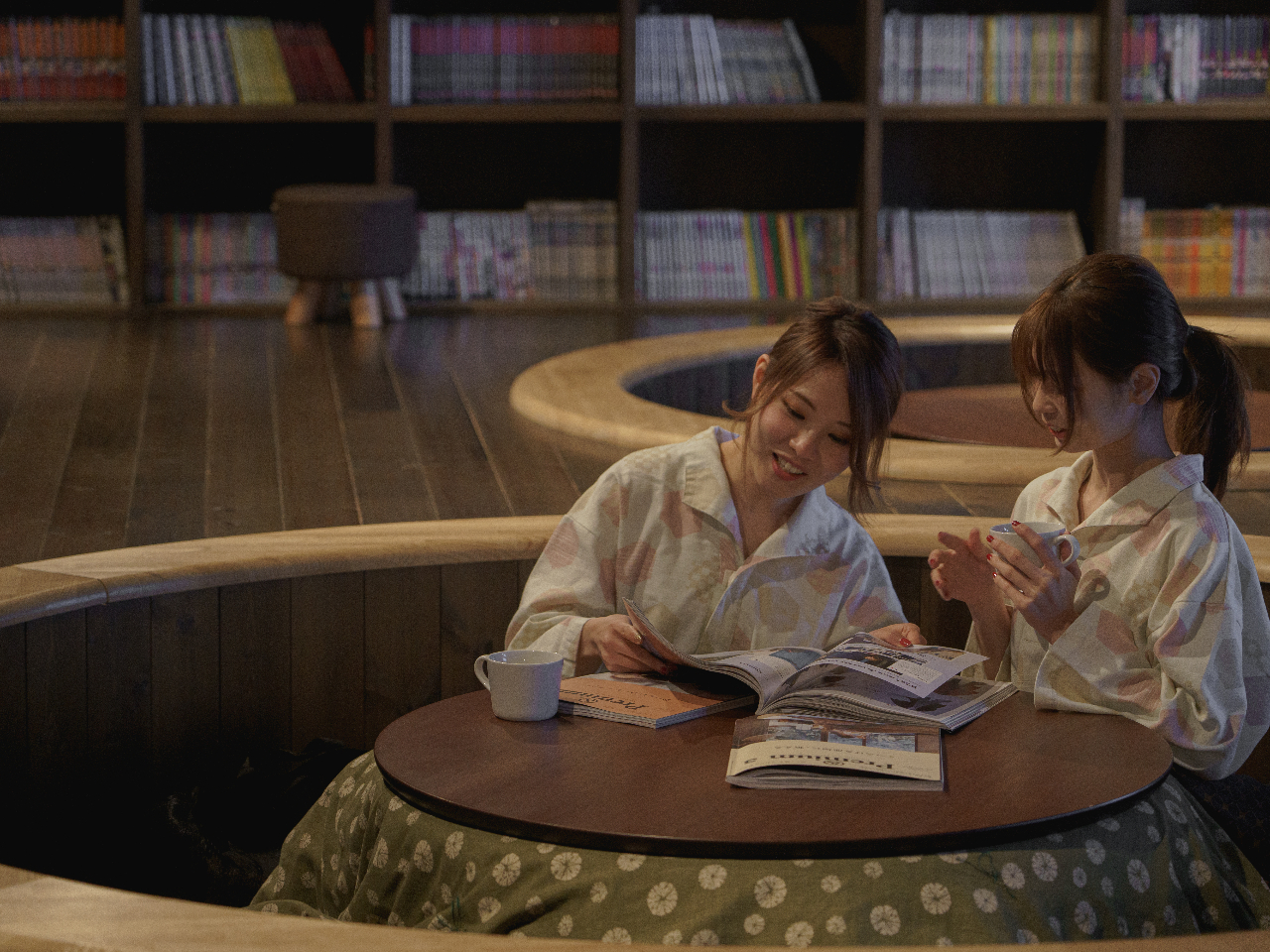 漫画や最新雑誌を取り揃えたライブラリースペース。ここでは無料の珈琲もお飲みいただけます。