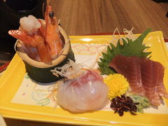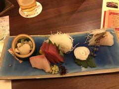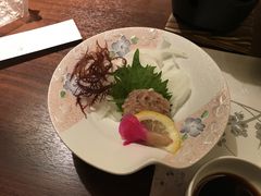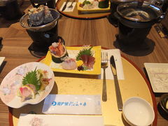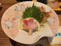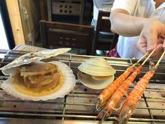 すでにテーブルに鯵のなめろう、刺身、さざえのつぼ焼き、アワビの踊り焼きがセッティングされています