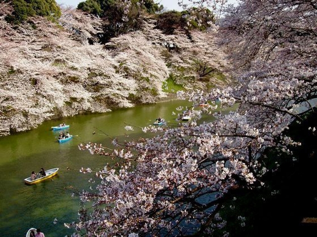 堂々とした武道館をバックにして濠の四方を美しい緑に囲まれた風景は都心とは思えぬ美しさ。濠沿いには約800mのガーデンロードの愛称で親しまれている緑の散歩道が続く。この千鳥が淵の名は、冬に都鳥などが多く集まるところからきたとも、V字形の濠の形が千鳥に似ているからともいわれている。