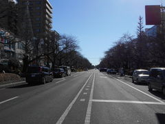 JR国立駅南口から一橋大学方面に向けて真っ直ぐに伸びる広い道路が大学通り。自動車道路脇には自転車専用道路、そして桜並木にゆったり歩道と狭い日本には例を見ない文教地区ならではの立派な道路です。