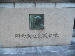 横浜市開港記念館の西側の道路に面したところに、天心のブロンズのレリーフをはめこんだ石碑がある。これは日本の美術文化に偉業を残した天心を慕い、開港百年事業として昭和34年に完成したもの。1862(文久2)年、天心はこの地にあった石川屋に生まれ、後に東京美術学校(現在の東京芸術大学)の設立に尽力した。
