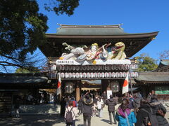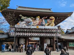 何の予備知識もなく行ったら時間制駐車場は満車の大渋滞、時間制でなく一回1200円の駐車場に駐車し何とかお参りができました。中も大変な混雑で初詣のようでしたが、厄落としのお参りのようで、祈願所の受付は長蛇の列で3時間待ちと書いてありました。神門に飾られた「迎春ねぶた」は見事なもので、青森のねぶた師の手によるものだそうです。