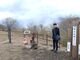 麓では2車線あった道路は1km程先からは車がすれ違えない程の狭く、急勾配、急カーブが連続する山道になった。第二東名の工事が大規模に行われていて、幅員が狭くなる箇所や工事車両の出入口には誘導員が立っている。山道を暫く進むと周囲が開けて所々に人家が建っている区画に出た。大野山山頂は見晴らしの良い区画にある三叉路の右方向であるが、その先は大野山牧場用の私道であるとの表示が立っている。三叉路から見晴らしの良い山道を2km程、麓から8km、30分程上ると山の斜面に牧場があり、山頂手前に観光客用の駐車場があった。山頂も含めて周囲の山の斜面は“大野山乳牛育成牧場”の管理地であるようで、注意書きの看板が立ち、駐車場から先は徒歩のみでの立入りが許されている。駐車場の脇から遊歩道が造られていて、入口付近には沢山の木の彫刻が置かれていた。遊歩道を250m程上ると大野山の頂上に達した。展望所やベンチ、トイレなどが奇麗に整備されている非常に広い原っぱであった。周囲に遮るものはなく、晴天であれば真西に富士山、北方にこれから向かう丹沢湖・三保ダム、北東側には丹沢山系の山並みが眺望できて、素晴らしい景色なのであろうが、曇天で南側の相模湾が眺望できるのみで残念であった。頂上付近で山桜が1本、南側斜面でミツマタの花が満開であった。少々不便な場所ではあるが、ピクニックには最高の場所であろう。